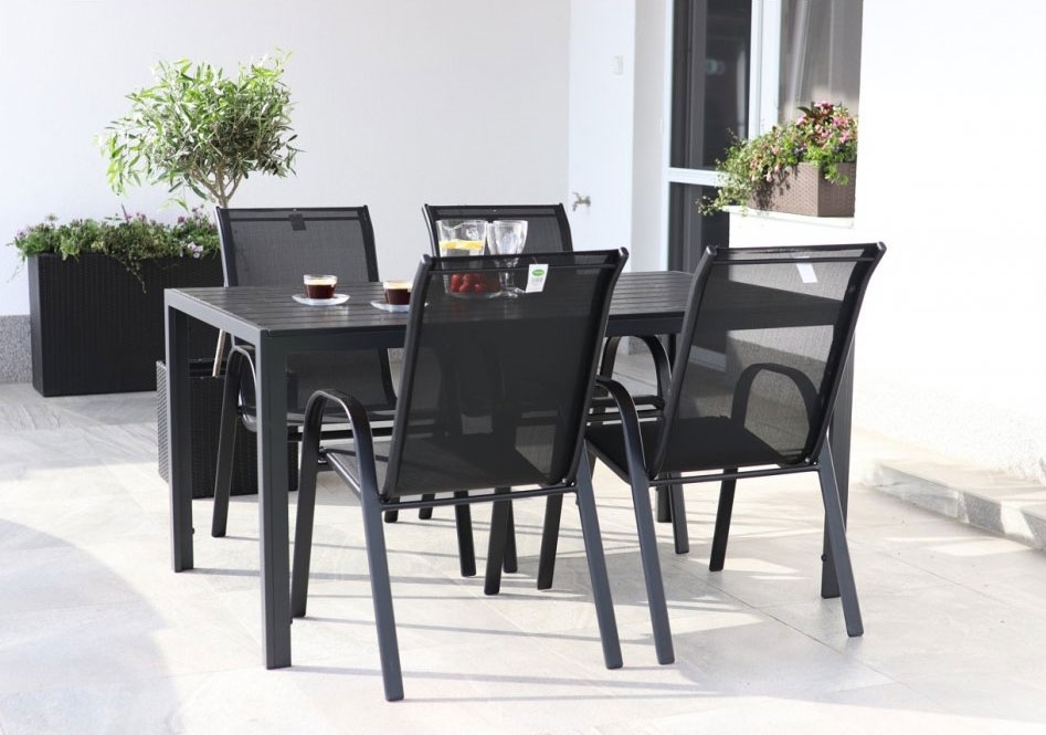 Sestava zahrnuje krásný a lehký stůl vyrobený z materiálů, které nevyžadují zvláštní údržbu. Konstrukce z hliníku ošetřeného proti rzi, deska stolu z Artwoodu a adaptéry u nohou pro větší stabilitu. Klasické tvary a černé provedení stolu.