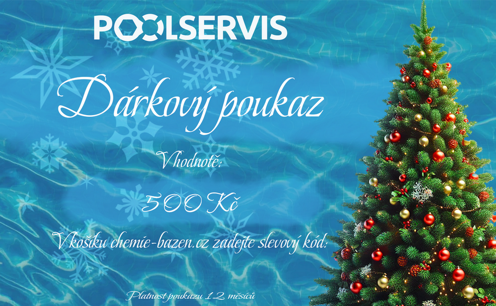 Vánoční dárkový poukaz na nákup na chemie-bazen.cz Hodnota poukazu: 500 Kč značky - tento produkt doručujeme v perfektní akci za 500 Kč. Upozorňujeme, že nabídka má omezenou platnost. Dopravné bez jakéhokoliv poplatku se nyní vztahuje na objednávky s minimální hodnotou 2.350 Kč. Už se těšíte na svoji objednávku?